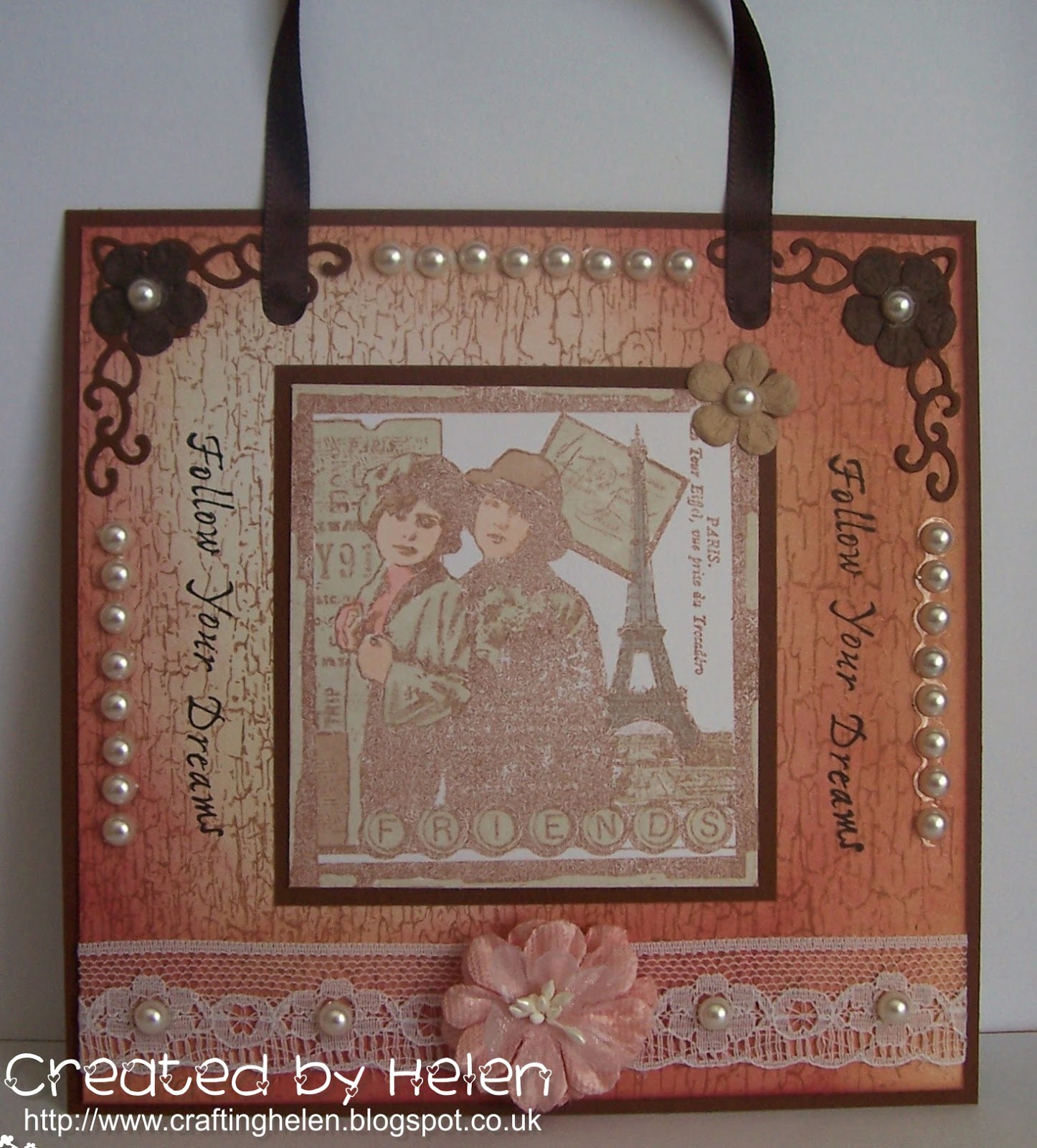 I've used a stamp from Crafty Individuals called 'Friends in Paris' which you can find here on their website. It was stamped in brown ink and then coloured with Promarkers.  The background was done using Distress Inks and then overstamped with a crackle stamp.  The corner dies are from Cheery Lynn and the flower is a Prima one.  Finally I've used some paper flowers, lace and pearls.